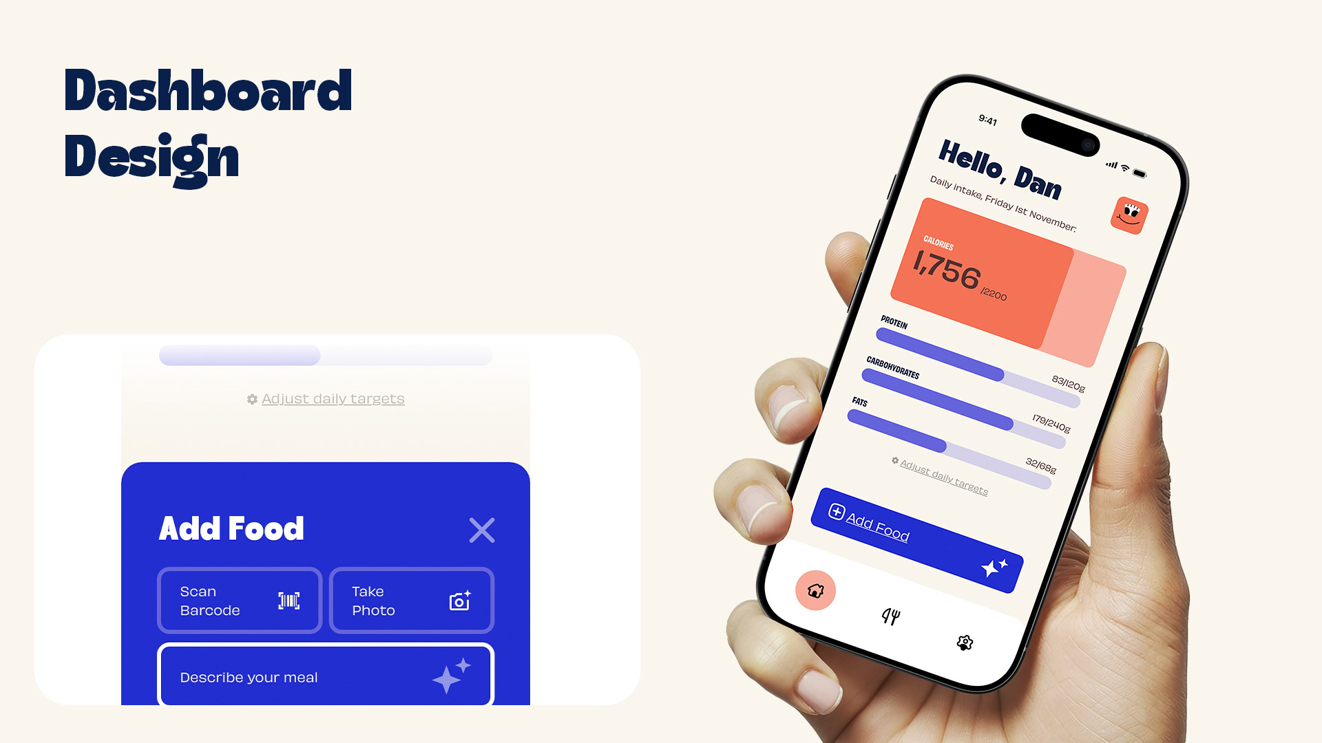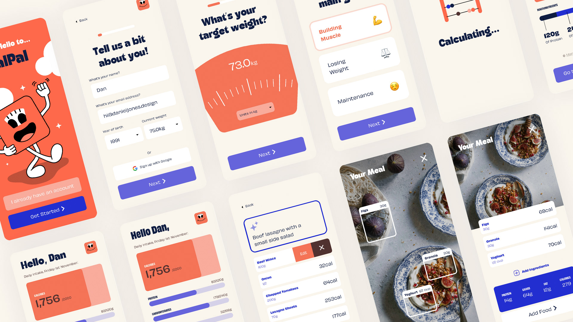 Branding and prototypes for a calorie tracking app called CalPal. Conducted user research to establish pain points with existing products. Developed a fun and easy going identity including a 'rubber-hose' style character and developed prototypes based on research findings.